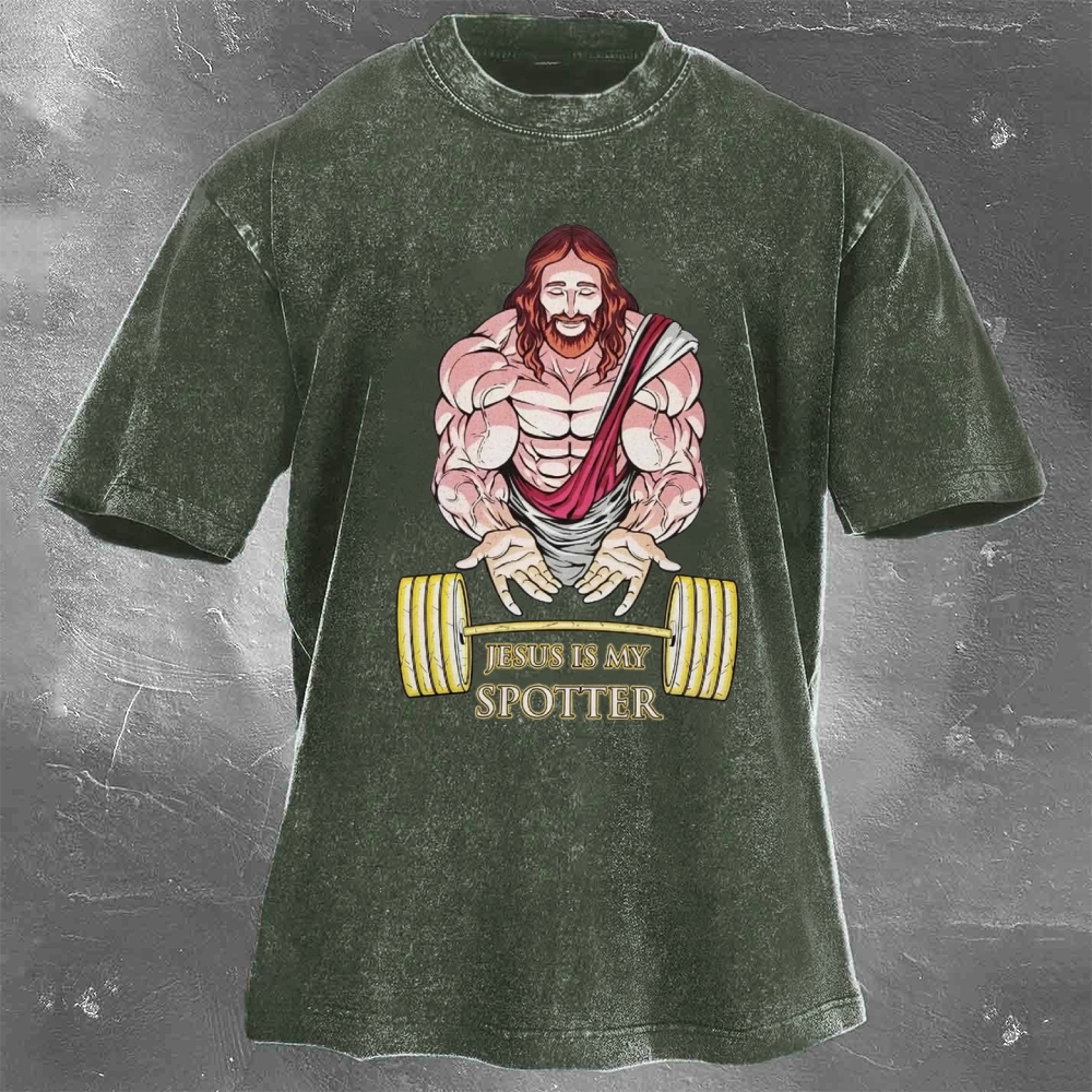 Jesus Is My Spotter Cartoon Print Washed Retro Casual T-Shirt