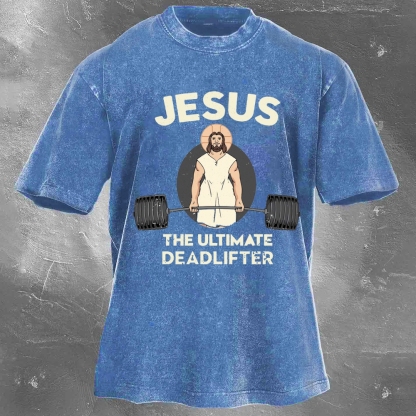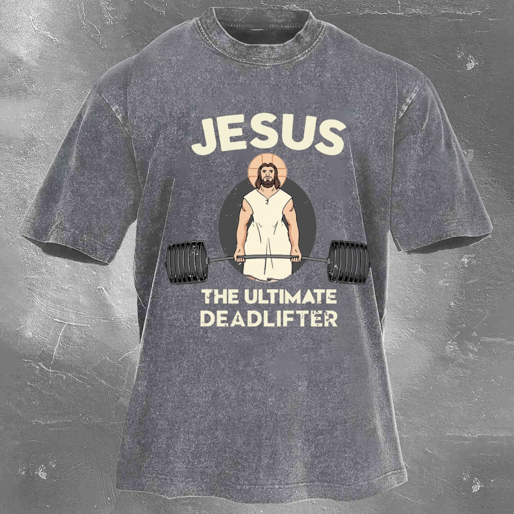 Jesus The Ultimate Deadlifter Print Washed Retro Casual T-Shirt