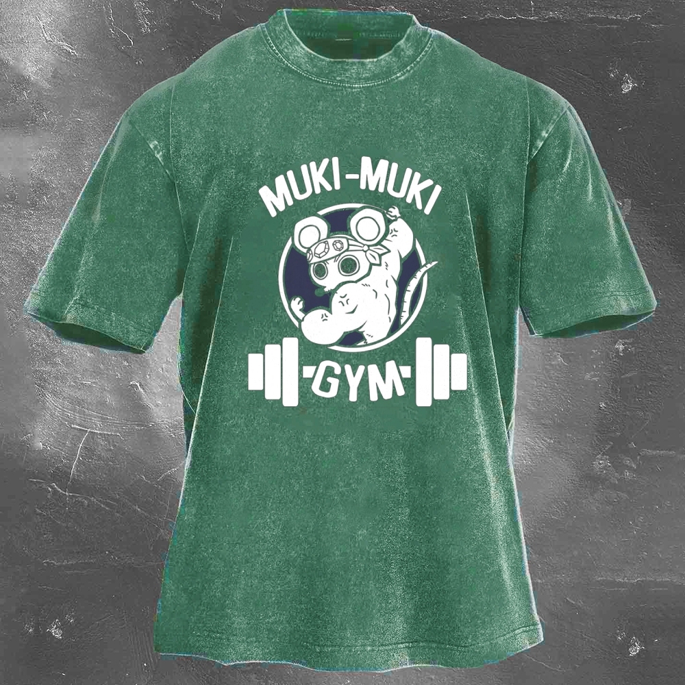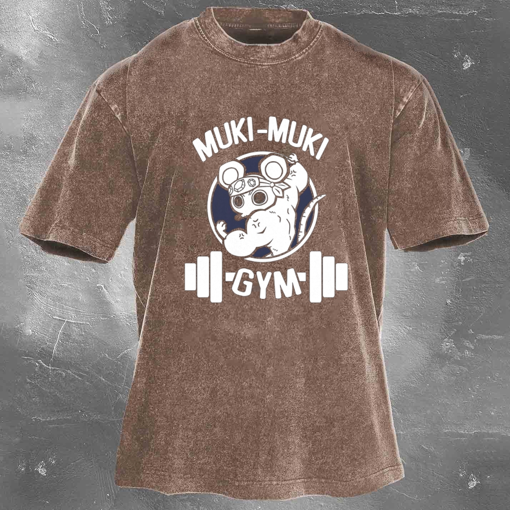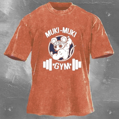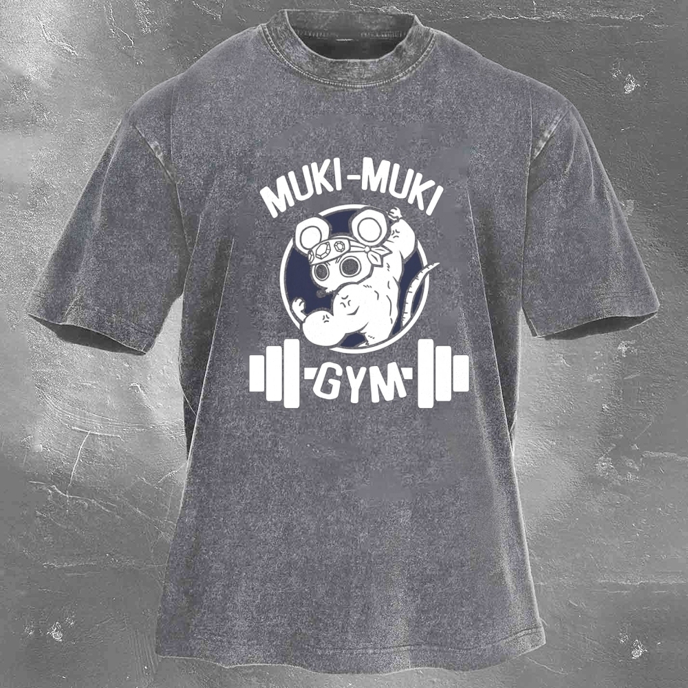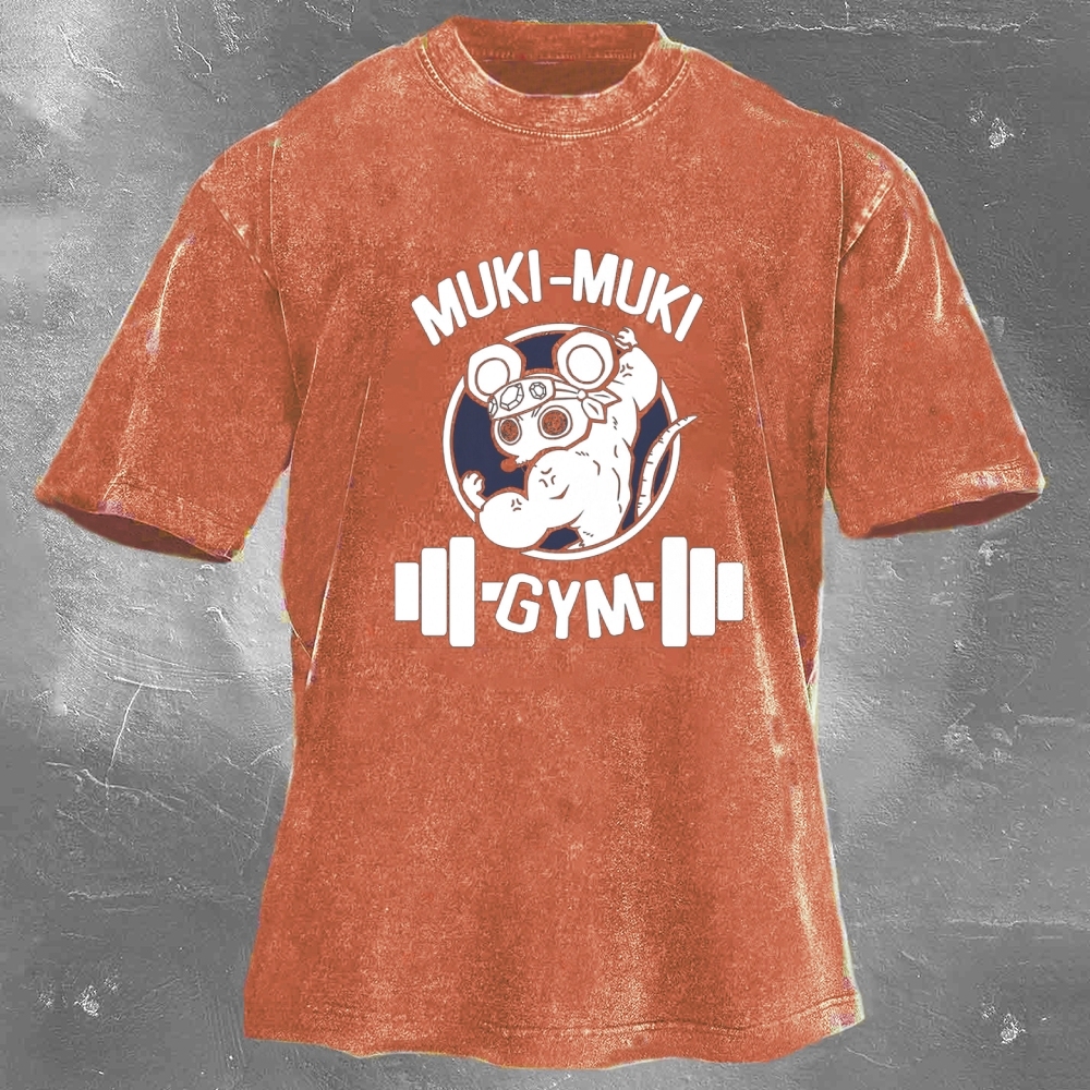 Muki-Muki Gym Print Washed Retro Casual T-Shirt