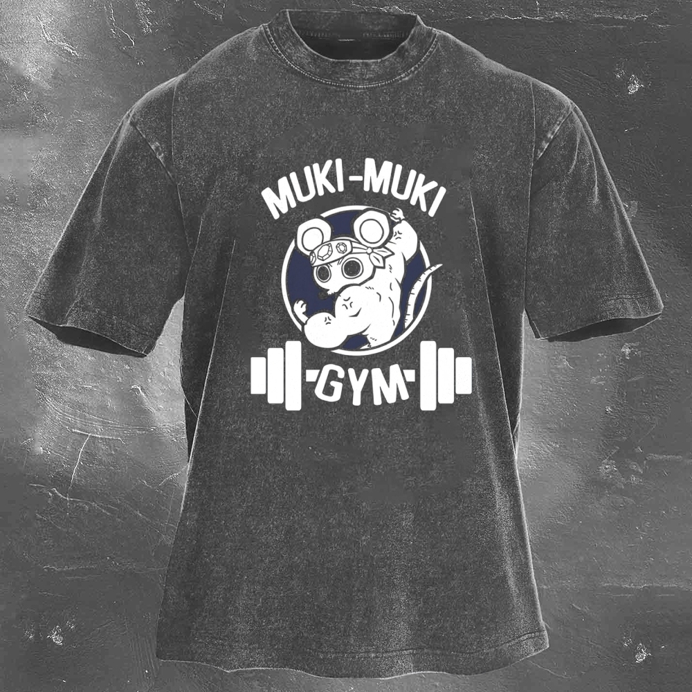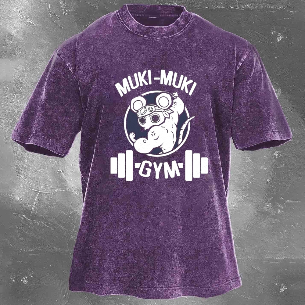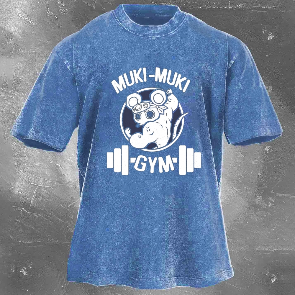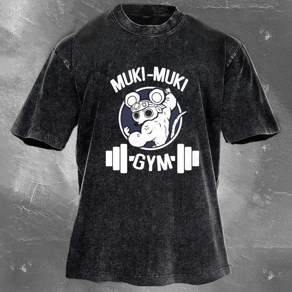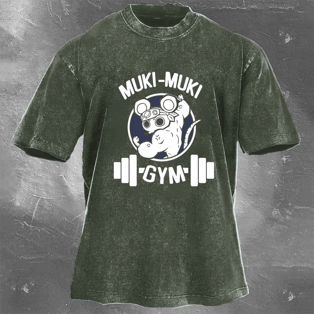 Muki-Muki Gym Print Washed Retro Casual T-Shirt