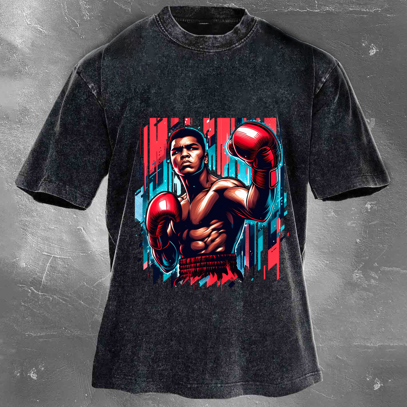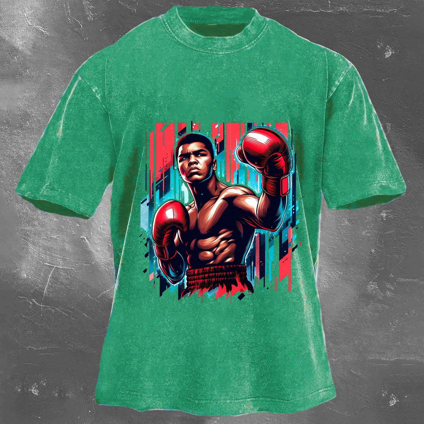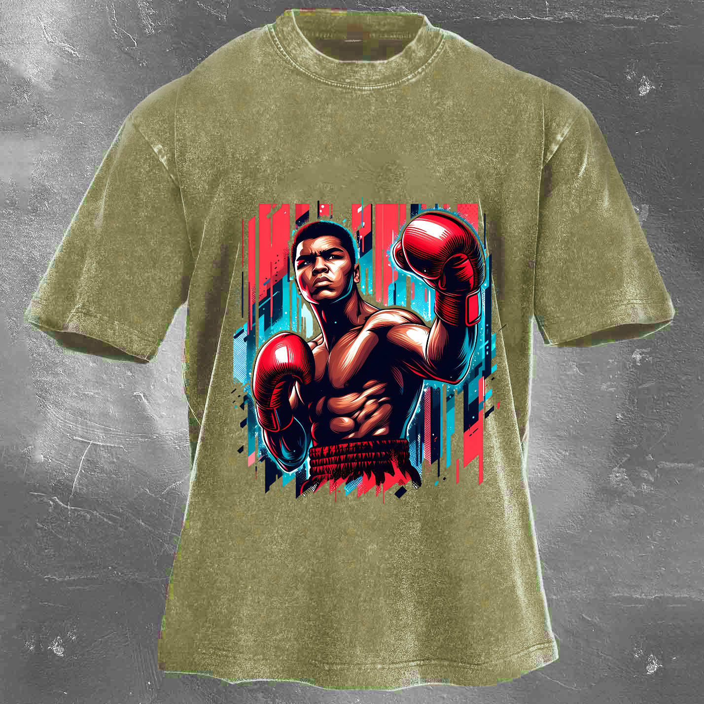 Street Fashion Trend Boxing Champion Pattern Print Unisex Vintage Washed T-Shirt