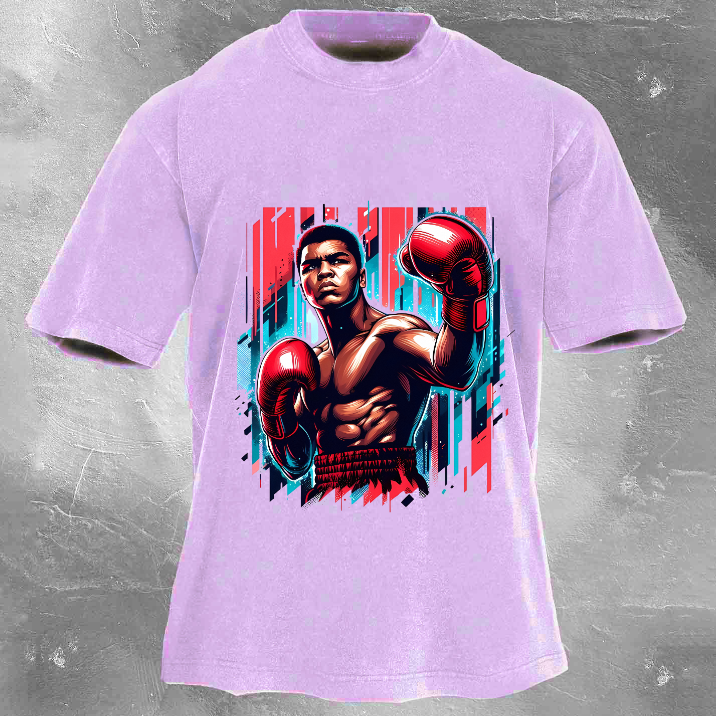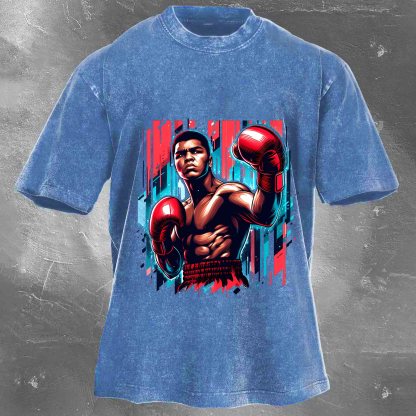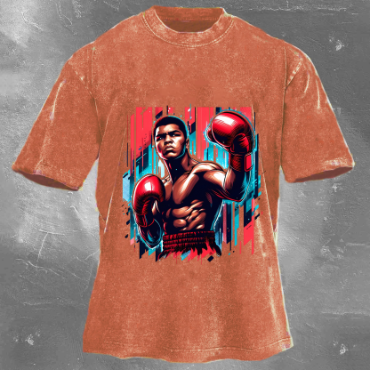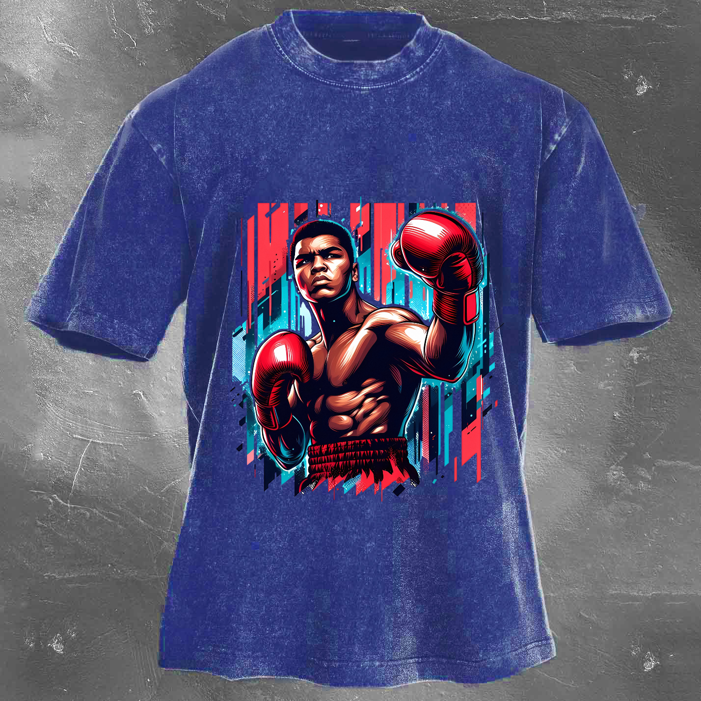 Street Fashion Trend Boxing Champion Pattern Print Unisex Vintage Washed T-Shirt